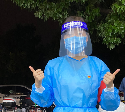 每个人严严实实穿着防护衣、戴着面罩和手套,虽然热得我都能清晰感觉到背后的汗水在往下滴,手心里直冒火,但大家都老老实实的。后来不经意间,我按了两下酒精凝胶搓手,那个舒服真的叫“透心凉”,发现这个小秘诀,立刻告诉队友们,凉快一下也是好的。